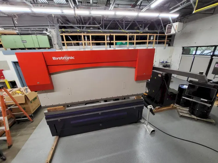 Used 2004 BYSTRONIC PR150X3100 press brake with 168 press capacity. Features include hydraulic press force, 122" bed length, upgraded servo motors, ESA S860 control, 6 CNC axes, electric foot switch, and CNC bed crowning.