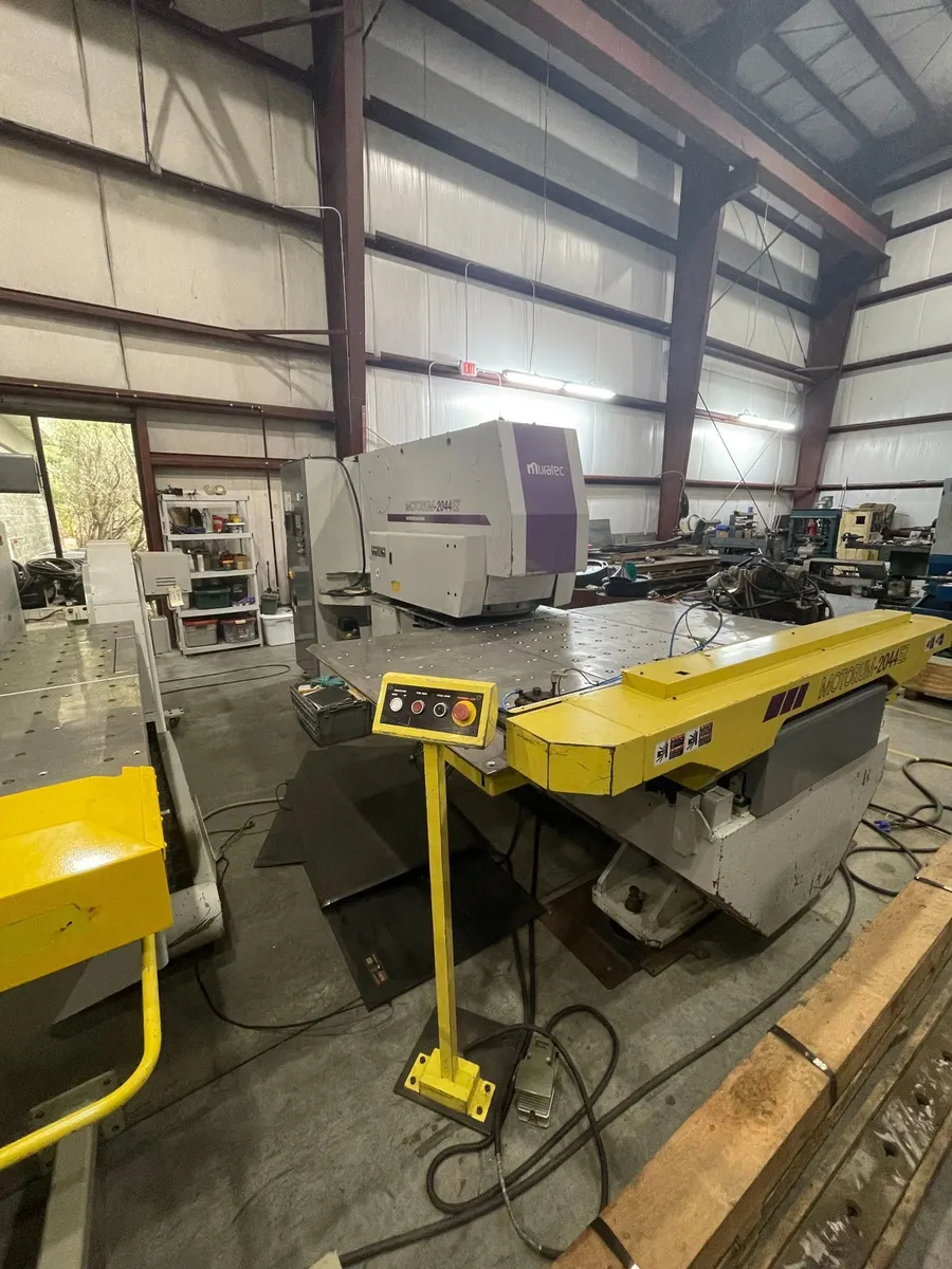 MURATA MOTORUM 2044EZ Turret Punch, 2002. Features 22-ton punch capacity, 4'x8' sheet capability with repositioning, 22 turret stations, and Fanuc 18i control. Equipped with 22 station turret and 2 F station auto index. No holders or tooling included.