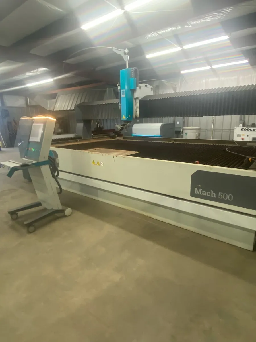 Used 2022 FLOW MACH 500 4020 XD Waterjet Cutter with powerful 94,000 PSI pump, 5-axis cutting head, and Flow PC controls. Offers 13' x 6' x 7" cutting area. Includes chiller unit and bulk transfer system. Low 115 hours of pump time.