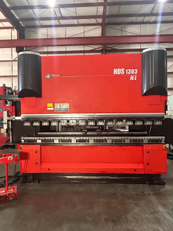 2008 Amada HDS-1303NT, 10' x 143 Ton CNC Hydraulic Press Brake with 5-axis control. Features include Amada AMNC NT CNC controls, hydraulic upper and lower clamps, and laser safety guarding. Used but professionally maintained.
