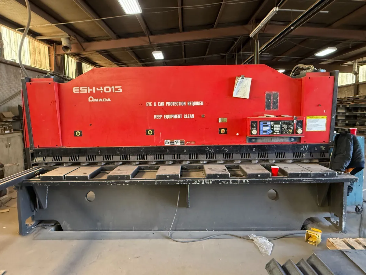 Amada EHS4013 power squaring shear, used 2002 model, cuts up to 0.5" thickness with a 13' blade, 30 kW hydraulic power, includes programmable back gauges, front squaring arm, and electric foot switch.