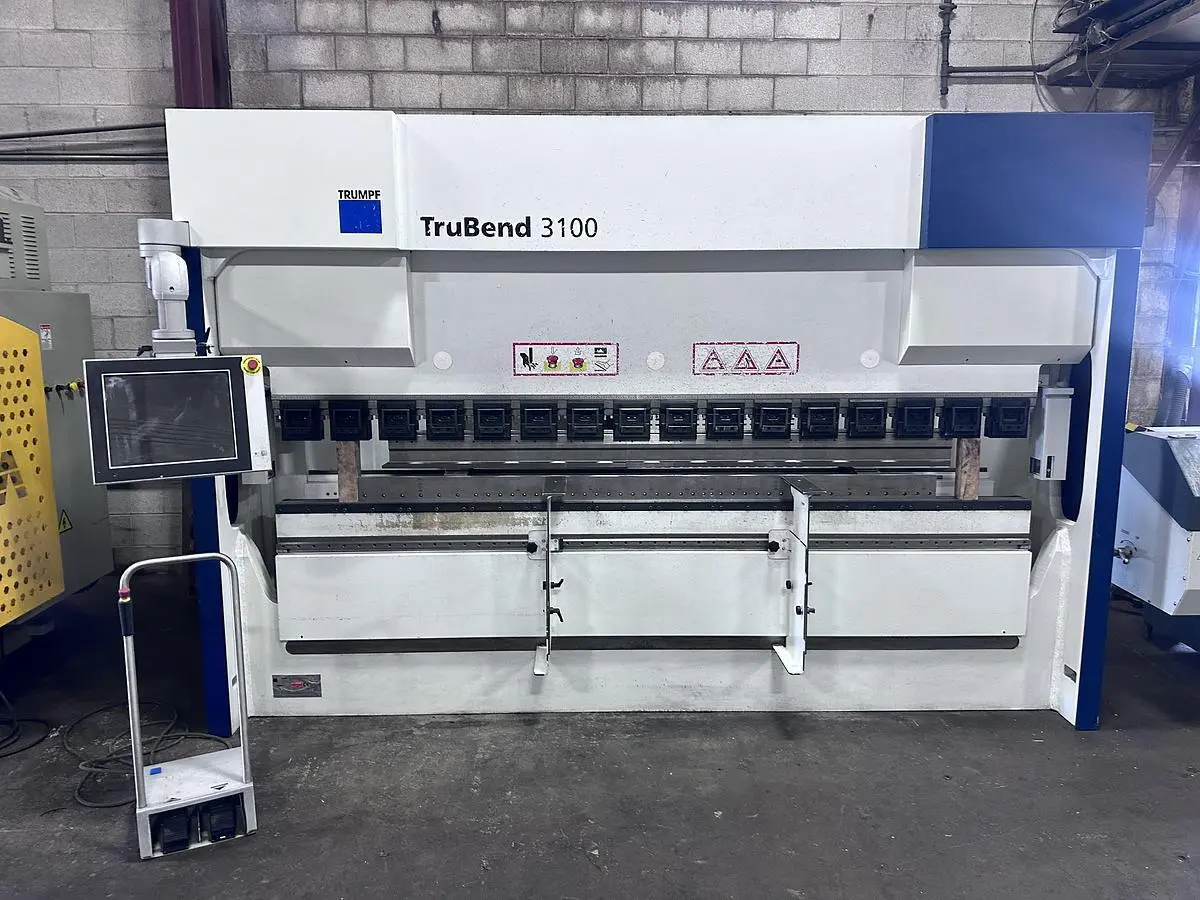 For sale: 2015 Trumpf TruBend 3100, 10' x 110 Ton Hydraulic Press Brake. Features 17" CNC control, hydraulic crowning, 4-axis back gauge, quick clamps, laser safety, and foot pedal control. Ideal for precision bending tasks.