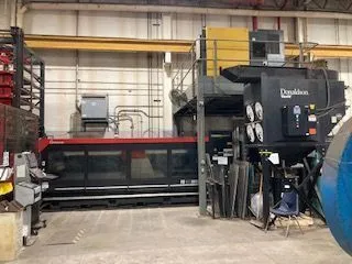 AMADA FOM2 3015 NT Laser Cutter, 20121, 4000W CO2 power, 5' x 10' table. Includes AMNC NT CNC controls, pallet shuttle table, Fanuc resonator, load/unload system, chiller, and dust collector.