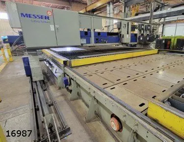Messer MPC2018 plasma cutter, 2017 model. Features include a 13.5' cut width, 15.5' cut length, 260A plasma power, and 1200 ipm speed. Equipped with Messer Global Control, Hypertherm plasma systems, and automatic plate alignment. Used condition.