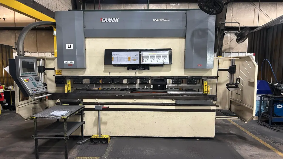 ERMAK CNC AP 132-8 press brake, 2008 model, used condition. Equipped with 132-tonnage capacity and an 8-foot overall length. Ideal for precision metalworking tasks in industrial settings.